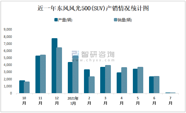 根據中國汽車工業協會數據可知:2021年7月東風風光500(SUV)產量為16輛,同比下降0%,銷量為41輛,同比下降0%,當月產銷率為256.25%;2021年1-7月東風風光500(SUV)累計產量為19951輛,同比下降0%,累計銷量為21239輛,同比下降0%,累計產銷率為106.46%;且2020年東風風光500(SUV)總產量大于總銷量,積壓了庫存1325輛。