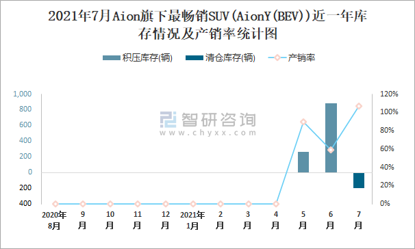2021年7月AION旗下最暢銷SUV(AionY(BEV))近一年庫存情況及產銷率統計圖
