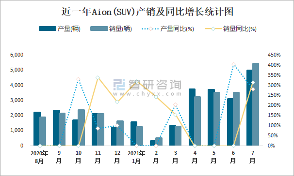 根據中國汽車工業協會數據可知:2021年7月Aion(SUV)產量為5004輛,同比增長281.4%,銷量為5434輛,同比增長315.4%,當月產銷率為108.59%;2021年1-7月Aion(SUV)累計產量為18818輛,同比增長475.7%,累計銷量為18765輛,同比增長467.1%,累計產銷率為99.72%;且2020年Aion(SUV)總銷量大于總產量,清倉庫存589輛。