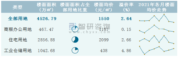 根據國信房地產信息網數據統計可知:2021年8月吉林省全部用地出讓地面均價為613元/㎡,其中商服辦公用地出讓地面均價最高(2321元/㎡),全部用地成交地面均價為549元/㎡,其中住宅用地成交地面均價為1282元/㎡,高于商服辦公用地成交地面均價;2021年1-8月吉林省住宅用地樓面面積占其全部用地比重最多,為63.11%,溢價率為2.66%。