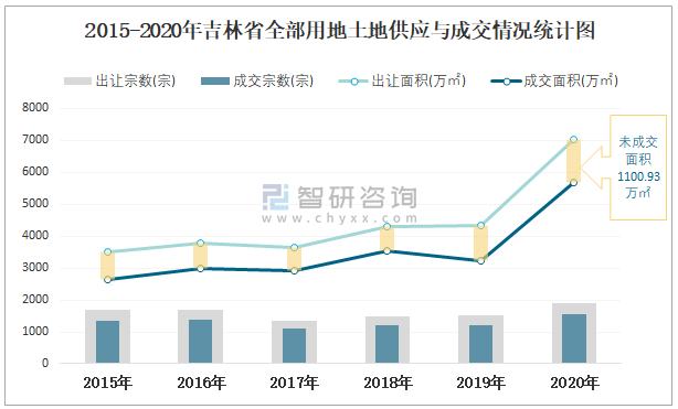 2015-2020年吉林省全部用地土地供應與成交情況統計圖