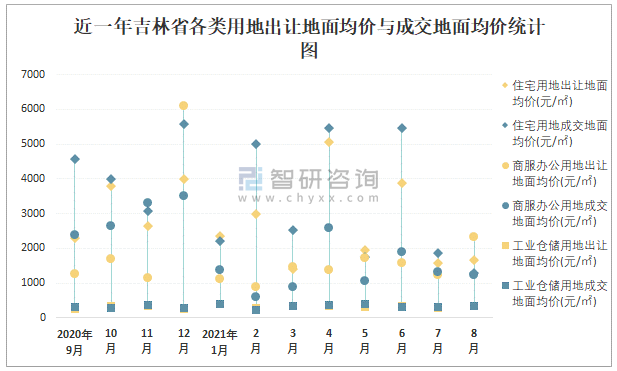 近一年吉林省各類用地出讓地面均價與成交地面均價統計圖