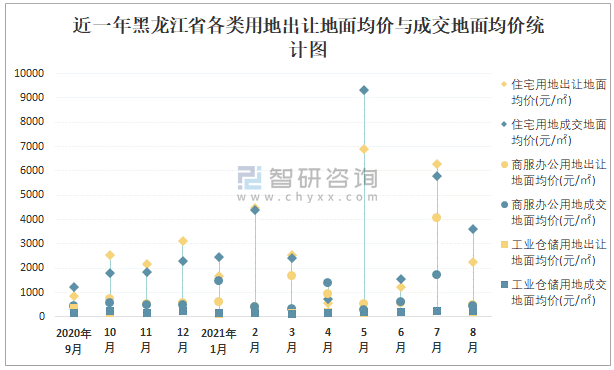 近一年黑龍江省各類用地出讓地面均價與成交地面均價統計圖