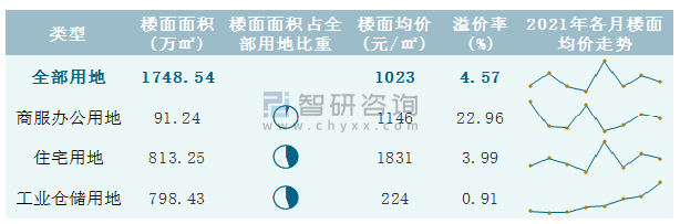根據國信房地產信息網數據統計可知:2021年8月黑龍江省全部用地出讓地面均價為655元/㎡,其中住宅用地出讓地面均價最高(2247元/㎡),全部用地成交地面均價為909元/㎡,其中住宅用地成交地面均價為3607元/㎡,高于商服辦公用地成交地面均價;2021年1-8月黑龍江省住宅用地樓面面積占其全部用地比重最多,為46.51%,溢價率為3.99%。