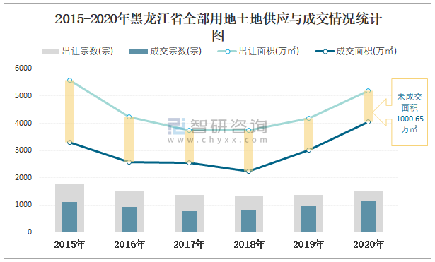 2015-2020年黑龍江省全部用地土地供應與成交情況統計圖