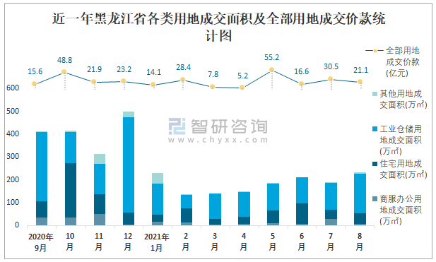 近一年黑龍江省各類用地成交面積及全部用地成交價款統計圖