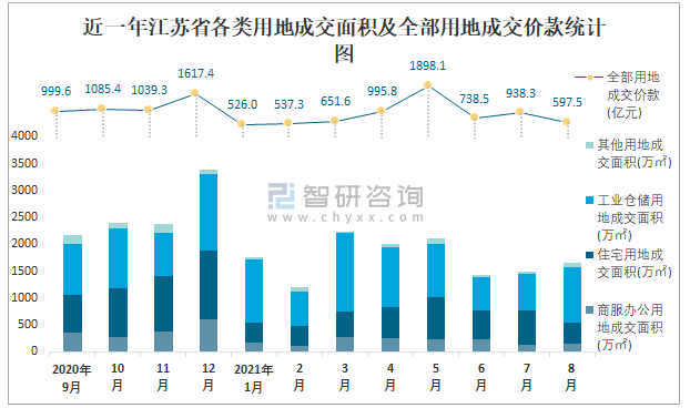 近一年江蘇省各類用地成交面積及全部用地成交價款統計圖