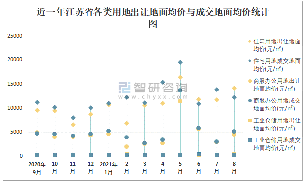 近一年江蘇省各類用地出讓地面均價與成交地面均價統計圖