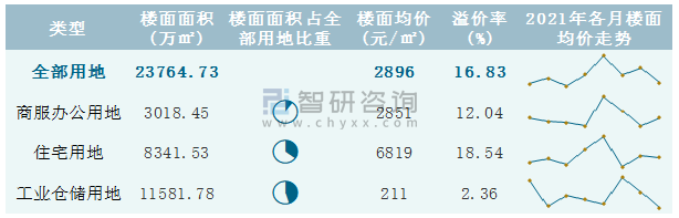 根據國信房地產信息網數據統計可知:2021年8月江蘇省全部用地出讓地面均價為5367元/㎡,其中住宅用地出讓地面均價最高(14173元/㎡),全部用地成交地面均價為3611元/㎡,其中住宅用地成交地面均價為12242元/㎡,高于商服辦公用地成交地面均價;2021年1-8月江蘇省工業倉儲用地樓面面積占其全部用地比重最多,為48.74%,溢價率為2.36%。