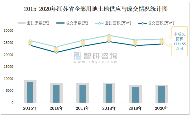 2015-2020年江蘇省全部用地土地供應與成交情況統計圖