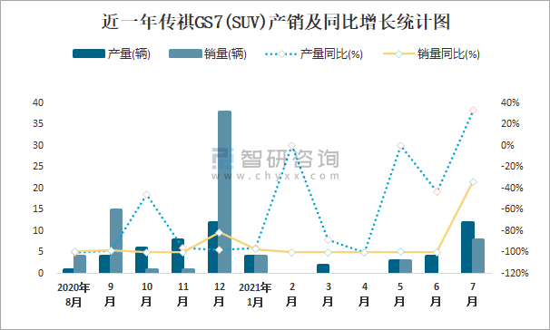 2021年7月傳祺GS7(SUV)產銷量分別為12輛和8輛 當月產銷率為66.67%