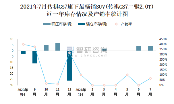 2021年7月傳祺GS7旗下最暢銷SUV(傳祺GS7二驅2.0T)近一年庫存情況及產銷率統計圖