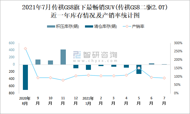 2021年7月傳祺GS8旗下最暢銷SUV(傳祺GS8二驅(qū)2.0T)近一年庫(kù)存情況及產(chǎn)銷率統(tǒng)計(jì)圖