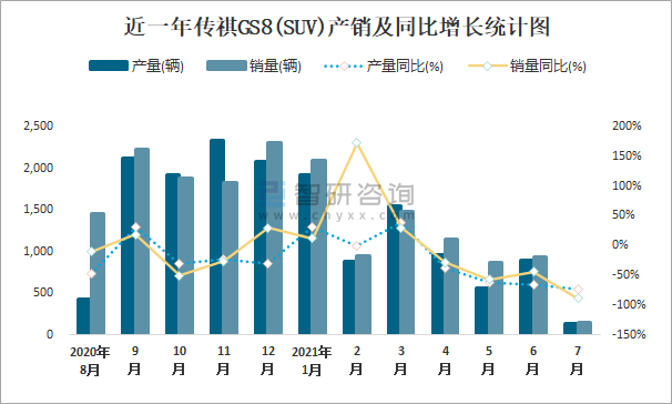 近一年傳祺GS8(SUV)產(chǎn)銷及同比增長(zhǎng)統(tǒng)計(jì)圖