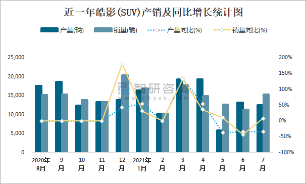 根據中國汽車工業協會數據可知:2021年7月皓影(SUV)產量為12505輛,同比下降34.8%,銷量為15354輛,同比增長8.1%,當月產銷率為122.78%;2021年1-7月皓影(SUV)累計產量為96752輛,同比增長20.5%,累計銷量為99147輛,同比增長27.2%,累計產銷率為102.48%;2019-2020年皓影(SUV)產銷量大幅度增加,且近2年總產量大于總銷量,積壓了庫存2802輛。