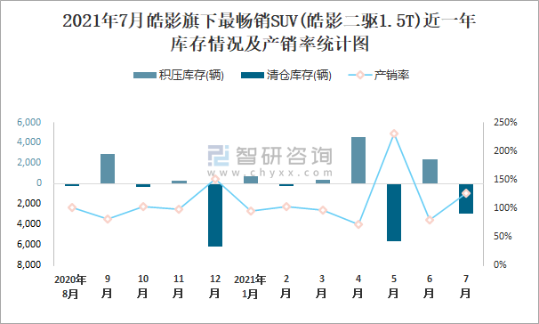 2021年7月皓影旗下最暢銷SUV(皓影二驅1.5T)近一年庫存情況及產銷率統計圖