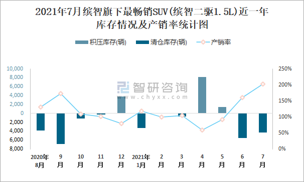 2021年7月繽智旗下最暢銷SUV(繽智二驅1.5L)近一年庫存情況及產銷率統計圖