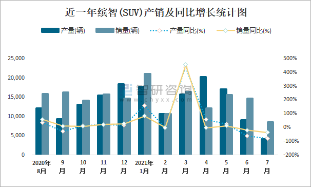 根據中國汽車工業協會數據可知:2021年7月繽智(SUV)產量為4200輛,同比下降80.9%,銷量為8505輛,同比下降36.9%,當月產銷率為202.5%;2021年1-7月繽智(SUV)累計產量為94680輛,同比增長15.7%,累計銷量為98923輛,同比增長34.4%,累計產銷率為104.48%;2016-2020年繽智(SUV)產銷量均在2019年跌至最低值,此后大幅度回升,且近5年總產量大于總銷量,積壓了庫存4495輛。