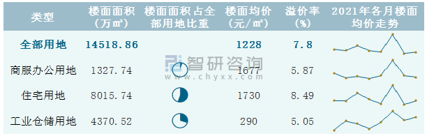 根據(jù)國信房地產(chǎn)信息網(wǎng)數(shù)據(jù)統(tǒng)計可知:2021年8月河南省全部用地出讓地面均價為1114元/㎡,其中住宅用地出讓地面均價最高(2903元/㎡),全部用地成交地面均價為1179元/㎡,其中住宅用地成交地面均價為3154元/㎡,高于商服辦公用地成交地面均價;2021年1-8月河南省住宅用地樓面面積占其全部用地比重最多,為55.21%,溢價率為8.49%。