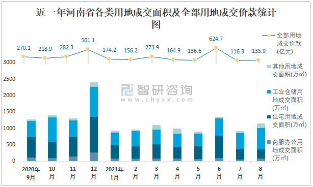 近一年河南省各類用地成交面積及全部用地成交價款統(tǒng)計圖