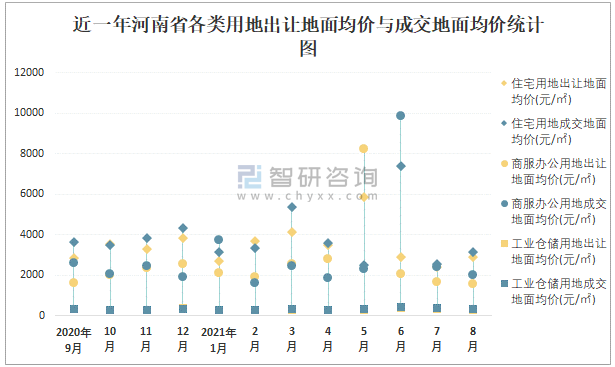 近一年河南省各類用地出讓地面均價與成交地面均價統(tǒng)計圖
