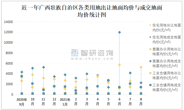 近一年廣西壯族自治區(qū)各類用地出讓地面均價(jià)與成交地面均價(jià)統(tǒng)計(jì)圖