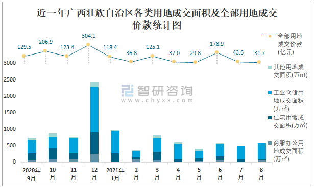 近一年廣西壯族自治區(qū)各類用地成交面積及全部用地成交價(jià)款統(tǒng)計(jì)圖