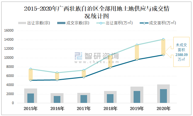 2015-2020年廣西壯族自治區(qū)全部用地土地供應(yīng)與成交情況統(tǒng)計(jì)圖