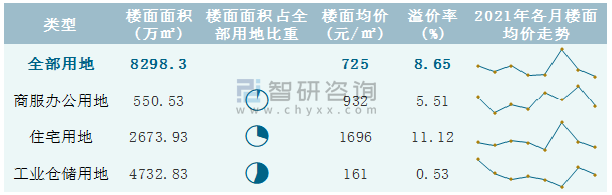 根據(jù)國信房地產(chǎn)信息網(wǎng)數(shù)據(jù)統(tǒng)計(jì)可知:2021年8月廣西壯族自治區(qū)全部用地出讓地面均價(jià)為1237元/㎡,其中住宅用地出讓地面均價(jià)最高(5312元/㎡),全部用地成交地面均價(jià)為533元/㎡,其中住宅用地成交地面均價(jià)為2309元/㎡,高于商服辦公用地成交地面均價(jià);2021年1-8月廣西壯族自治區(qū)工業(yè)倉儲用地樓面面積占其全部用地比重最多,為57.03%,溢價(jià)率為0.53%。