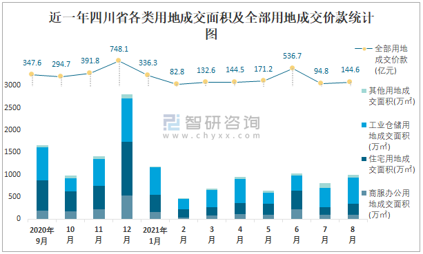近一年四川省各類用地成交面積及全部用地成交價款統計圖