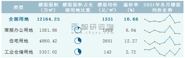 根據國信房地產信息網數據統計可知:2021年8月四川省全部用地出讓地面均價為1723元/㎡,其中住宅用地出讓地面均價最高(4051元/㎡),全部用地成交地面均價為1461元/㎡,其中住宅用地成交地面均價為4411元/㎡,高于商服辦公用地成交地面均價;2021年1-8月四川省工業倉儲用地樓面面積占其全部用地比重最多,為44.04%,溢價率為2.72%。