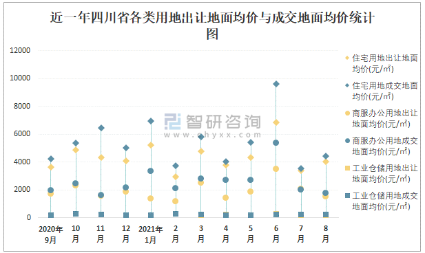 近一年四川省各類用地出讓地面均價與成交地面均價統計圖