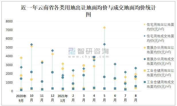 近一年云南省各類用地出讓地面均價與成交地面均價統計圖