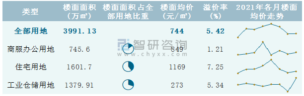 根據國信房地產信息網數據統計可知:2021年8月云南省全部用地出讓地面均價為936元/㎡,其中住宅用地出讓地面均價最高(1959元/㎡),全部用地成交地面均價為1132元/㎡,其中住宅用地成交地面均價為2662元/㎡,高于商服辦公用地成交地面均價;2021年1-8月云南省住宅用地樓面面積占其全部用地比重最多,為40.13%,溢價率為7.25%。