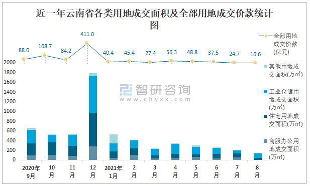 近一年云南省各類用地成交面積及全部用地成交價款統計圖