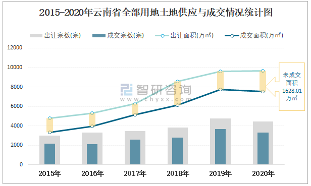2015-2020年云南省全部用地土地供應與成交情況統計圖