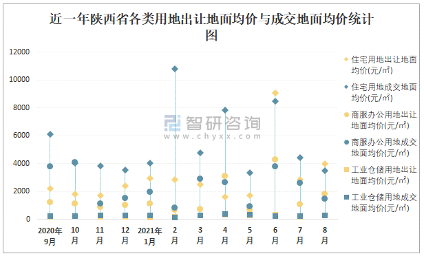 近一年陜西省各類用地出讓地面均價與成交地面均價統(tǒng)計圖