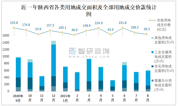 近一年陜西省各類用地成交面積及全部用地成交價款統(tǒng)計圖