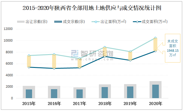 2015-2020年陜西省全部用地土地供應與成交情況統(tǒng)計圖