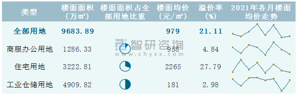 根據(jù)國信房地產(chǎn)信息網(wǎng)數(shù)據(jù)統(tǒng)計可知:2021年8月陜西省全部用地出讓地面均價為1044元/㎡,其中住宅用地出讓地面均價最高(3987元/㎡),全部用地成交地面均價為905元/㎡,其中住宅用地成交地面均價為3489元/㎡,高于商服辦公用地成交地面均價;2021年1-8月陜西省工業(yè)倉儲用地樓面面積占其全部用地比重最多,為50.7%,溢價率為2.98%。