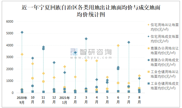 近一年寧夏回族自治區各類用地出讓地面均價與成交地面均價統計圖