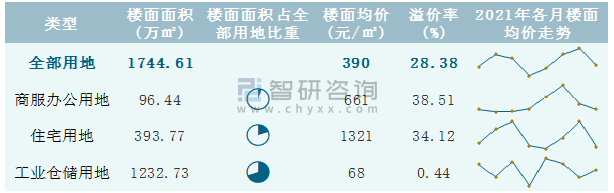 2021年8月寧夏回族自治區土地出讓面積為281.7萬㎡,同比增長15.3%,環比增長495.57%;根據國信房地產信息網數據統計可知:2021年8月寧夏回族自治區全部用地出讓地面均價為589元/㎡,其中住宅用地出讓地面均價最高(1456元/㎡),全部用地成交地面均價為477元/㎡,其中住宅用地成交地面均價為1234元/㎡,高于商服辦公用地成交地面均價;2021年1-8月寧夏回族自治區工業倉儲用地樓面面積占其全部用地比重最多,為70.66%,溢價率為0.44%。