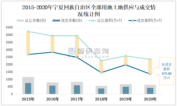 2015-2020年寧夏回族自治區全部用地土地供應與成交情況統計圖