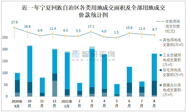 近一年寧夏回族自治區各類用地成交面積及全部用地成交價款統計圖