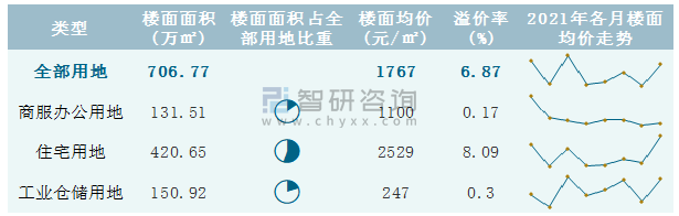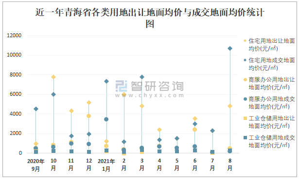 根據國信房地產信息網數據統計可知:2021年8月青海省全部用地出讓地面均價為1878元/㎡,其中住宅用地出讓地面均價最高(4837元/㎡),全部用地成交地面均價為2520元/㎡,其中住宅用地成交地面均價為10682元/㎡,高于商服辦公用地成交地面均價;2021年1-8月青海省住宅用地樓面面積占其全部用地比重最多,為59.52%,溢價率為8.09%。