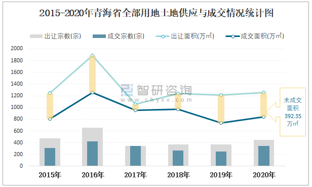 2015-2020年青海省全部用地土地供應與成交情況統計圖