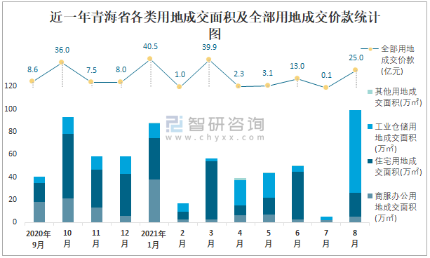 近一年青海省各類用地成交面積及全部用地成交價款統計圖