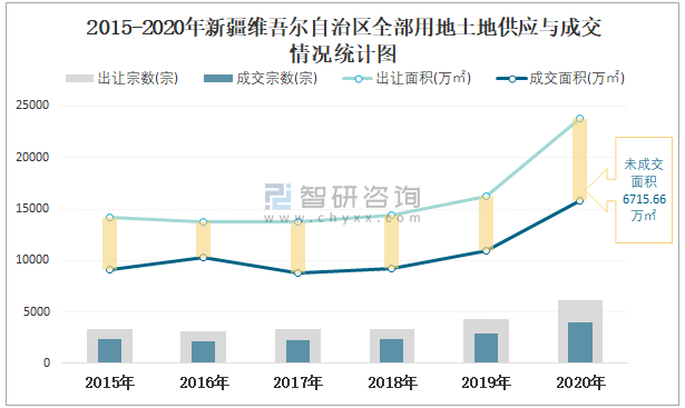 2015-2020年新疆維吾爾自治區(qū)全部用地土地供應(yīng)與成交情況統(tǒng)計圖