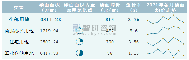 根據(jù)國信房地產(chǎn)信息網(wǎng)數(shù)據(jù)統(tǒng)計可知:2021年8月新疆維吾爾自治區(qū)全部用地出讓地面均價為323元/㎡,其中住宅用地出讓地面均價最高(930元/㎡),全部用地成交地面均價為249元/㎡,其中住宅用地成交地面均價為971元/㎡,高于商服辦公用地成交地面均價;2021年1-8月新疆維吾爾自治區(qū)工業(yè)倉儲用地樓面面積占其全部用地比重最多,為59.36%,溢價率為1.15%。