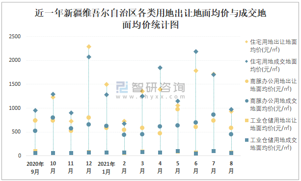 近一年新疆維吾爾自治區(qū)各類用地出讓地面均價與成交地面均價統(tǒng)計圖